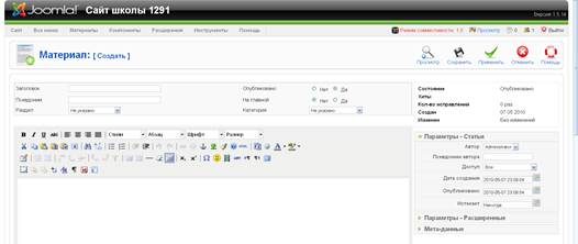 Создание нового материала начинается с указания названия статьи,выбра раздела и категории, к которым она будет относиться. Так же имеется возможность разрешить или запретить публикацию и указать размещение начала статьи на главной странице.