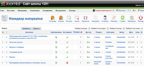 Внешний вид страницы похож на интерфейс страниц «Разделы» и «Категории», исключением являются кнопки, с помощью которых статью можно поместить в архив и извлечь из архива, и «Настройки».