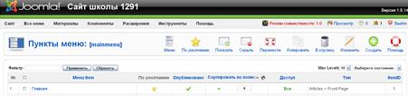 Все имеющиеся статьи, для того, чтобы они отображались на сайте, должны быть подключены к меню. Редактировать необходимо «Главное меню»,находящееся в «Все меню» (рис. 25)