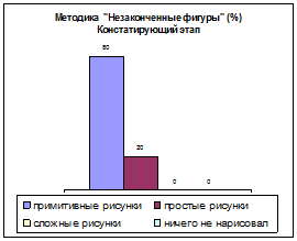 Для определения уровня развития воображения у учащихся отобрано три методики: "Незаконченные фигуры", "Придумай игру", "Нарисуй что-нибудь". Каждая методика подразумевала выполнение какого-то задания, которое в конце оценивалось в соответствии с критериями. После чего результаты методик обрабатывались, и было видно, на каком уровне развития находится воображение учащихся. Затем на основе результатов строилась диаграмма. Так на учащихся 8 класса Ермаковской средней школы проводилась опытно-экспериментальная работа. На констатирующем этапе необходимо было определить, каким уровнем воображения обладают учащиеся. При проведении методики "Незаконченные фигуры" учащимся раздавались листы бумаги с нарисованными на них фигурками (кругами, квадратами, треугольниками, разными ломаными линиями и т.д.).