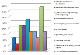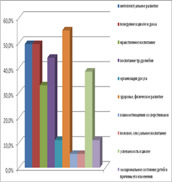 Данные исследования (Диаграмма №10) свидетельствуют, что этот аспект является важным и для наших респондентов, 55% выбирают здоровье и физическое развитие как наиболее актуальную проблему воспитания. Кроме того, для родителей значимым является интеллектуальное развитие детей, а также поведение ребенка в школе и дома (по 49,5% ответов). Родители отмечают и другие проблемы воспитания: воспитание трудолюбия (44%), успеваемость в школе (38,5%), нравственное воспитание (33%). Лишь небольшое число родителей (11% ответов) считают, что необходимо воспитывать у ребенка умение организовывать свой досуг, учитывать эмоциональное состояние детей считают необходимым также 11% родителей. Важно отметить, что родители не уделяют внимания вопросам полового воспитания и отношениям со сверстниками (по 5,5%).