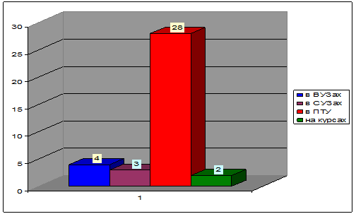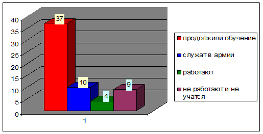 Проанализировав сведения о занятости выпускников детского дома мы получили следующие данные. Из 39 выпускников 37 человек продолжили обучение: из них 4 человека обучаются (обучались) в высших учебных заведениях, в СУЗах – 3 человека, в ПТУ – 30 человек, обучаются на курсах – 2 человека, 15 человек работают, 5 – служат в армии, не работают и не учатся – 9 человек. Из выпускников 16 человек создали свои семьи, 5 из них зарегистрировали брак. Из 39 выпускников детского дома: