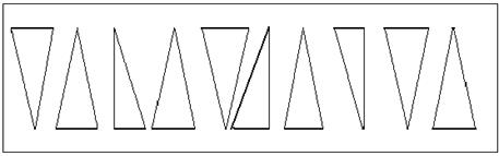 3-й уровень - при срисовывании допускаются грубые искажения узора, которые повторяются и при самостоятельном его продолжении; заданная закономерность в расположении линий нарушена: пропущены отдельные элементы узора (например, одна из горизонтальных линий, соединяющих вершины, сглажены или совсем нивелированы различия в высоте вершин).