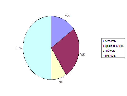 Как можно видеть из таблицы 4 и рисунка 5 распределение факторов креативности среди учащихся по методике Туник является прямо противоположным. Здесь ведущим является фактор точности (50%), далее следует фактор оригинальности (26%), беглости (15%) и гибкости (9%).