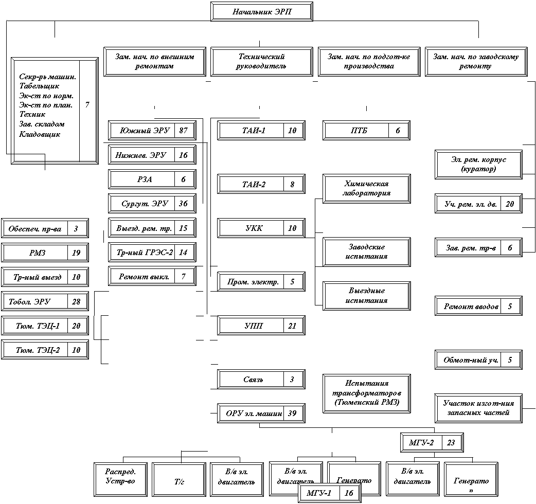 На рис. 1. представлена структурная схема электроремонтного производства (ЭРП) АООТ «ЦКБ Энергоремонт», где я и проходил практику. Общее количество человек, занятых в ЭРП – 298, в т. ч. рабочих - 229 человек. А аббревиатуры расшифровываются следующим образом: