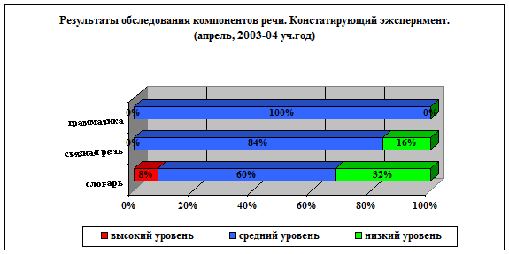 Следует остановиться на анализе выполнения заданий по каждому из изученных компонентов речи: лексический уровень речи - состояние словаря, грамматическое оформление речи - состояние грамматического строя речи и состояния связной речи. Таким образом,