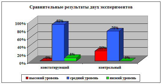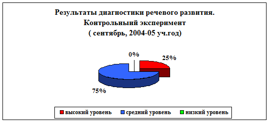 1. В контрольном эксперименте появился высокий уровень речевого развития (25% - 3 чел.), низкий уровень отсутствует, что также свидетельствует об эффективности проводимой работы.
