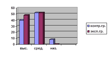 Полученные данные свидетельствуют о том, что средний показатель уровня интеллекта в двух группах одинаков, но в экспериментальной группе процент детей с высоким показателем повысился, с низким - равен нулю. В контрольной группе остались дети с низким показателем уровня интеллекта.