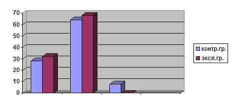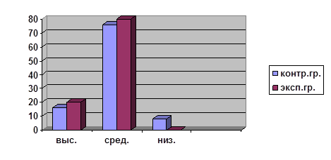 Полученные данные свидетельствуют о том, что в экспериментальной группе уровень интеллекта по всем показателям повысился, в то время как в контрольной группе этот показатель изменился, но всё же в этой группе есть дети с низким уровнем интеллекта, а в экспериментальной группе этот показатель равен нулю.