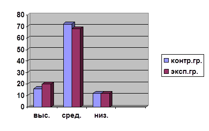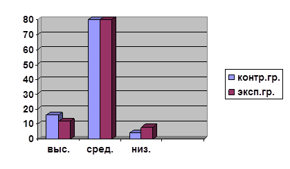 Полученные данные свидетельствуют о том, что среднее значение выполнения теста соответствуют 80% у детей контрольной группы, 80% - у детей экспериментальной группы. Используя нормы интеллектуального развития, полученный показатель можно интерпретировать как средний уровень развития общего и невербального интеллекта. Однако, не все дети обследованной нами группы имеют показатели интеллектуального развития в границах средних значений. По показателям общего и невербального интеллекта обследуемые группы детей неоднородны по своему составу, подавляющее большинство детей, а именно 80% имеет значение интеллектуального развития, укладывающееся в рамках возрастной нормы.
