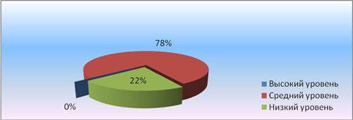 На констатирующем этапе диагностического исследования дети показали различный уровень развития речевой деятельности. Низкий уровень был выявлен у 2 детей, что составляет 22% от общего числа воспитанников в исследуемой группе. Остальные были примерно на одинаковом среднем уровне. Это 78% детей. К сожалению, высокий уровень развития речевой деятельности не был обозначен ни у одного ребенка.