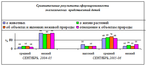 Хотелось бы сказать, что положительная динамика в формировании экологических представлений об объектах природы и отношения к ним детей, выявлена, но необходимо продолжить работу в этом направлении, т. к. максимальный результат не достигнут, дети лишь в средней возрастной группе и тем более только начало учебного года. К концу обучения в средней группе дети должны различать и называть конкретные виды деревьев и кустарников, травянистых растений, животных разных экологических групп; знать основное строение растений, некоторые особенности органов животного, замечать и понимать признаки «живого» – движение, питание, состояние по сезонам; иметь представления о росте и развитии растений и животных, о месте обитания и способах существования. Должно быть сформировано бережное отношение к объектам природы, которое заключается в любознательности детей, эмоциональном общении с природой, принятии активного участия в уходе за растениями и животными, включаясь в деятельность взрослых и осознание необходимости бережного отношения к объектам природы, мотивируя его нравственно-эстетическим, практическим и средообразующим значением для природы и людей.