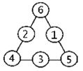 Расставь числа 6, 5, 4, 3, 2, 1 в кружках так, чтобы сумма чисел в каждой прямой равнялась 12.