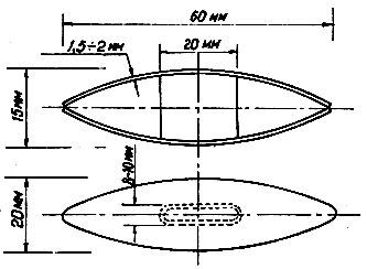 Челнок можно сделать самим, используя для этого пластмассу, оргстекло, полистирол, металл, дерево и другие материалы. Он представляет собой две изогнутые пластины, соединенные между собой так, чтобы их концы соприкасались, и намотанная нить не проскальзывала между ними и не смогла самопроизвольно разматываться во время работы. При намотке нити и при разматывании ее должен раздаваться легкий щелчок. Размеры челнока - от 6 до 8 сантиметров по длине от 1,5 до 2 сантиметров по высоте. На рисунке даны, на мой взгляд, самые удобные для женских рук размеры челнока. И еще один совет: постарайтесь на пластинах сделать небольшое углубление, чтобы во время работы челнок не выскальзывал из ваших рук. [6]