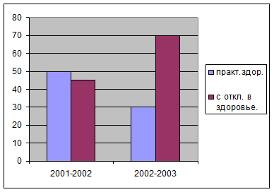 Анализ данных, приведенных на рисунке № 1, показывает, что увеличилось на 20% количество детей, имеющих отклонения в здоровье. Во многом этот факт объясняется тем, что среди набранных первоклассников в 2002-2003 учебном году большее количество детей имеют хронические заболевания.