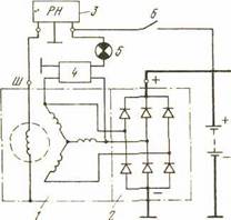 Рис. 2. Схема соединений генераторной установки переменного тока с контрольной лампой заряда аккумуляторной батареи: 1 — генератор; 1 — выпрямительное устройство; 3 — регулирующее устройство; 4 — реле контроля заряда; 5 — контрольная лампа; 6 - выключатель зажигания |