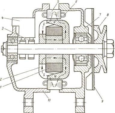 Рис. 3. Схема устройства автомобильного генератора переменного тока: 1 - обмотка возбуждения; 2 - клювообразные полюса; 3 - контактные кольца; 4 - щеткодержатешь; 5 - статор; 6 – трехфахзная обмотка статора; 7 – крышка со стороны привода; 8 – шкив; 9 – вентилятор; 10 – крышка со стороны контактных колец
