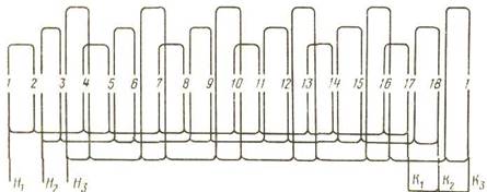 Н1, Н2, Н3; К1 К2, К3 — начало и концы фаз первой звезды;