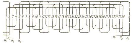 Поскольку схема соединения катушек между собой не зависит от числа витков в катушке, то все катушки изображены одновитковыми. Начала и концы всех трех фаз обмотки статора обозначены соответственно буквами Н и К. Для соединения в звезду концы всех фаз K1, К2 и К3. соединяются между собой и образуют нулевую точку обмотки. Начала трех фаз Н1, Н2 и Н3 соединяются с выводами. Соединение треугольником применяется редко из-за сложности монтажа катушек: конец первой фазы К1 соединяется с началом второй фазы Н2, конец второй К2 — с началом третьей Н3; конец третьей К3 с началом первой фазы К1 и от всех этих точек соединения подводятся провода к выводным зажимам.