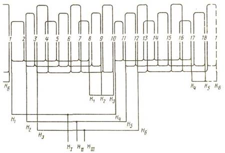 Рис. 7. Схема соединений обмоток фаз статора в двойную звезду (число пазов 18): Н1 H2, Н3 К1 K2 К3 — начала и концы фаз первой звезды; Н4 Н5. Н6: К4, K5,К6 — начала и концы фаз второй звезды; HI , HII ,HIII – выводы фаз обмоток статора