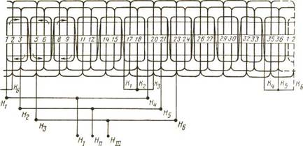 При соединении в двойную «звезду» каждая фаза состоит из двух параллельных ветвей, в каждой ветви по три непрерывно намотанных катушки (рис. 7).