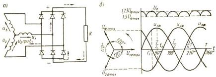 а — соединение трехфазной обмотки генератора с вентилями по трехфазной двухполупериодной схеме (схема А. Н. Ларионова); б — векторная диаграмма (слева) и кривые изменения мгновенных значений фазных напряжений по времени, а также кривая выпрямленного напряжения (справа); R - сопротивление нагрузки