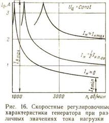 В отличие от внешних характеристик, снятых при самовозбуждении, ток короткого замыкания генератора здесь больше номинального тока нагрузки и имеет максимальную величину при максимальной частоте вращения. Значение тока нагрузки, определяемое при независимом возбуждении, больше значения гока нагрузки, определяемого по схеме самовозбуждения, на величину тока возбуждения.