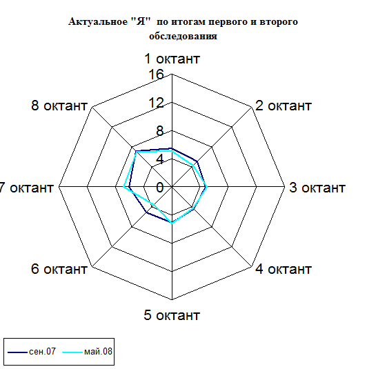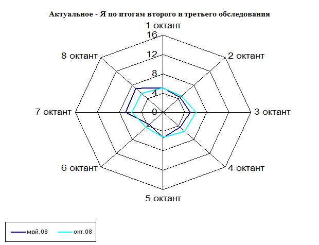 По итогам второго обследование мы видим, что профиль образа «Психолог» остался неизменным. А в профиле «Актуальное – Я» присутствуют изменения по шкалам 2 (уверенность в себе – самоуверенность самовлюбленность), 6 (доверчивость послушность – зависимость) и 7 (добросердечие несамостоятельность — чрезмерный конформизм). По шкалам 2 и 6 изменения произошли от больших значений к меньшим, эти показатели отражают тип уверенного в себе человека, со склонностью к соперничеству, но без признаков эгоцентризма. Высокие показатели по шкале 7 отражают ориентацию на принятие и социальное одобрение.