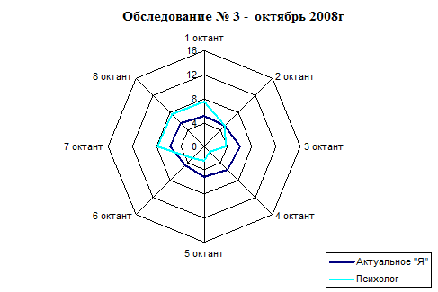 На рисунке 3 мы видим, что в профиле «Психолог» не появилось значительных изменений по равнения с предыдущими обследованиями (Рис. 1, Рис 2), а профиль «Актуальное – Я» имеет различия по 3 (субшкала агрессивность), 4 (субшкала подозрительности), 7 (субшкала дружелюбия) и 8 (субшкала альтруистичности) шкалам. Увеличение результатов по третьей шкале свидетельствует о появление таких черт, как жестокость, враждебность к окружающим. Высокие оценки по 4 шкале связаны с такими чертами, как негативизм, склонность к сомнению во всем. Следовательно, результаты по шкалам 7 и 8 отражают снижение уровня дружелюбного отношения и альтруистичности.