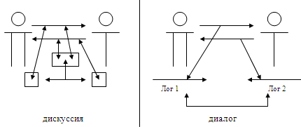 Как было сказано выше (см. п. 2.1.1), дискуссия характеризуется обменом мнений или версий по какому-либо вопросу, в дискуссии обнаруживается некоторое основание, его наличие; диалог же предполагает обращение к основаниям. На рисунке это можно изобразить следующим образом.
