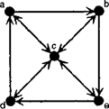 Звездообразная круговая сеть с пятью точками a,b,c,d,e. Диада аb представляет собой модель Шеннона, где a – источник, b – получатель. Если рассмотреть всю систему в целом, то а может быть получателем для d, а также и источником и получателем для точки с: