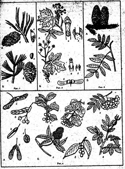 Оборудование: облиственные побеги; плоды и семена различных видов лиственных пород (клены — остролистный, полевой, ясенелистный, татарский; дубы — летний, зимний, красный; тополи — черный, белый, осина; ольха — черная, серая и др.); линейки, лупы, ножи; рабочие тетради;