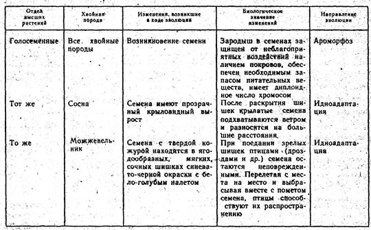 При формулировании выведя учащиеся отмечают, что ароморфозы приводят к возникновению новых; более высокоорганизованных групп растений или животных, далее эволюция продолжается путем, идиоадаптаций - эволюционных изменений без повышения уровня организации, благодаря которым происходит более полное заселение среды в результате освоения в ней разнообразных местообитаний. Так, развитие плода явилось одним из ароморфозов, обусловивших возникновение цветковых (покрытосеменных) растений, у которых в дальнейшем выработались различные частные приспособления к распространению плодов и находящихся внутри; них семян.