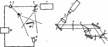 4 — транспарант; 5 — светоделитель; 6 — линза; 7, 10 — зеркала; 8 — плоскость изображения объекта; 9 — фотопластинка.