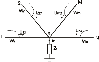 Расчет производим по правилу эквивалентной волны. Данный метод заключается в следующем: пусть в узле x сходятся n линий, по которым в узел х набегают волны перенапряжения Umx. К узлу х подключено сопротивление нагрузки Zх. Каждая линия обладает собственным волновым сопротивлением Wm (Рисунок 2.1.).