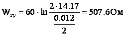 где Wтр – волновое сопротивление троса; Ер – разрядная напряженность, Ер=750кВ/м; v – скорость движения волны, v=250м/мкс; к – коэффициент электромагнитной связи, к=0.23; lп – длина пролета, lп=90 м; lт-п – расстояние трос-провод, при учете защитного угла троса, м.