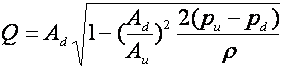 где Q - объемный расход (м3/с); Au и Ad - площади поперечных сечений потокпровода и сопла (м2); pu и pd - давление до и после препятствия (сопла) в текучей среде (Па); r - плотность текучей среды (кг/м3). Поскольку значения Au и Ad постоянны, формула (1.6) фактически задает туже функциональную зависимость (т.е. пропорциональность объемного расхода потока величине (pu-pd)1/2), что и формула (1.5) для трубки Пито.