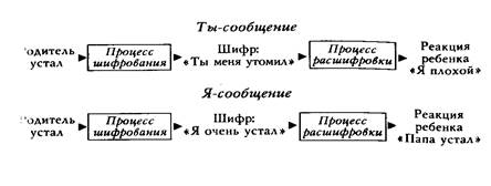 Я-сообщения являются более эффективным способом в плане влияния на ребенка с целью изменения его поведения, которое родитель не приемлет. В то же время они сохраняют благоприятные взаимоотношения между людьми. Воспользуемся примером Томаса Гордона и нарисуем схему сообщений для родителя, который устал и не испытывает желания играть со своим сынишкой.