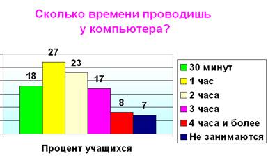 Гигиенические требования использования учащимися персональных компьютеров приобретают день ото дня все большую актуальность: компьютеризация стремительно входит в нашу жизнь, растет число компьютеров в школах, все большей популярностью пользуются они у подростков. Для значительной части молодежи работа на компьютере, выполнение домашних заданий, а еще больше – игры, стали привычной формой времяпрепровождения. Очевидно, что эта тенденция будет развиваться и что без компьютера современному образованному человеку на рынке труда делать нечего. К примеру, проводя опрос среди обучающихся нашей школы, мы выяснили следующее: