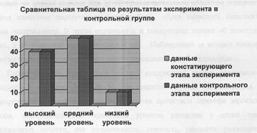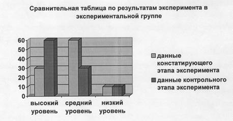 В экспериментальной группе количество детей находящихся на высоком уровне составляет 60%, на среднем уровне находится 30% детей, на низком уровне так и осталось 10% испытуемых.