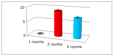 Как видно из графика детей с первой группой здоровья нет. Со второй группой 9, с третьей группой здоровья 7 детей.