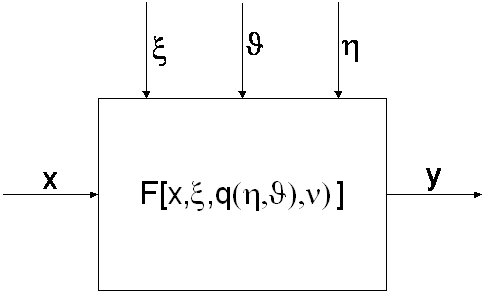 В реальных приборах функция преобразования зависит не только от сигнала x(t), но также от возмущения x(t) на сигнал x(t), от помехи J(t), действующей на параметры прибора q(t), от несовершенства технологий изготовления прибора h(t) и от помехи n(t), возникающих в самом приборе (трения, паразитных ЭДС и др.), т. е.