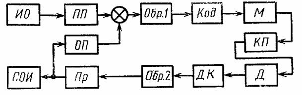 На рис. 2 дана функциональная схема прибора, на которой указаны: исследуемый объект ИО; первичный преобразователь П1; устройство сравнения УС; устройство обработки сигналов Об. 1, в котором производится селекция, усиление, коррекция погрешностей, фильтрация и др.; кодирующее устройство Код; модулятор М; канал передачи КП; устройство детектирования Д; устройство декодирования ДК; устройство обработки информации Oбр. 2, обеспечивающее функциональное преобразование, коррекции погрешностей, формирование функции преобразования (1) и др.; преобразователь Пр, выдающий информацию на систему отображения СОИ и на обратный преобразователь 0П, с которого поступают сигналы на устройство сравнения. Эта схема является обобщенной и включает ряд элементов, которые в более простых приборах могут отсутствовать.