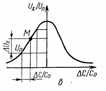 . На склонах, резонансной кривой (Рис. 9, в) мелено выбрать участок, близкий к линейному, в середине которого выбирается рабочая точка М, соответствующая среднему значению емкости C