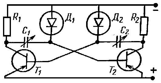 Емкостным преобразователь может быть элементом в схеме триггера. На Рис. 10 приведена схема мультивибратора, на выходе которого генерируется непрерывная последовательность импульсов.