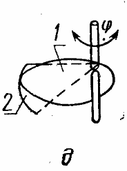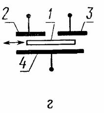 Рассматриваемая схема может быть использована в приборах уравновешивания. Для этого усиленный сигнал с конденсатора после фазочувствительного детектирования может быть подан на обкладки 1 и 2, вследствие чего на средний электрод будет действовать электростатическая сила, уравновешивающая измеряемую силу. На Рис. 11, г и д показаны схемы устройства емкостных преобразователей с переменной площадью. В схеме на Рис. 11, г диэлектрик 1 перемещается по стрелке, а в схеме на Рис. 11, д один из электродов 2 жестко связан с валом и совершает угловые перемещения относительно неподвижного электрода 1.
