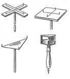 Для построения на местности углов в 45, 90, 135 градусов и других служат экеры (рис. 16). Они бывают различной конструкции: крестообразные, в виде прямоугольного треугольника, квадратной доски, цилиндрические и другие. Экеры применяются в практике не только для построения углов, но и для проведения параллельных и взаимно перпендикулярных линий, для проведения высот в треугольниках, при съемке планов земельных участков и др.