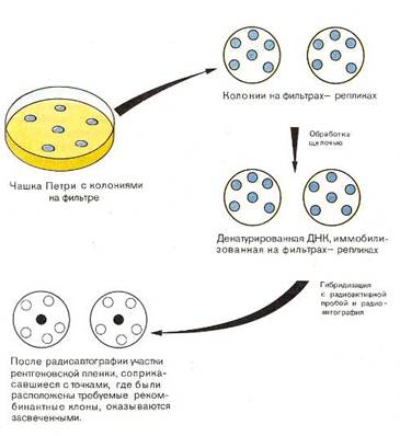 Рис. 4. Метод радиоавтографии в применении к поиску рекомбинантных клонов[14].