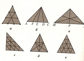 Ответы: а) 13 треугольников; б) 27 треугольников; в) 47 треугольников; г) 27 треугольников; д) 32 треугольника; е) 48 треугольников.