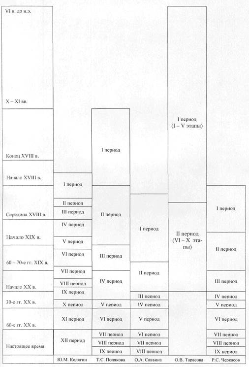 С целью наглядности приведем сводную таблицу всех рассмотренных авторских периодизаций.